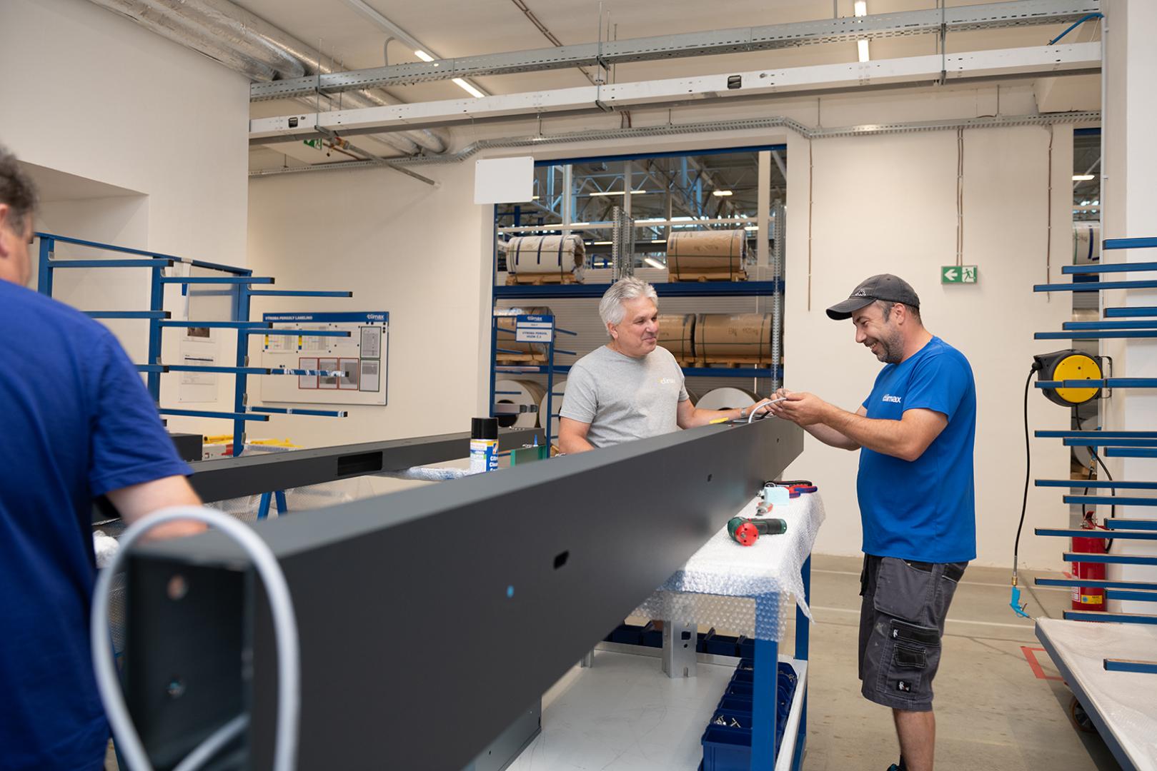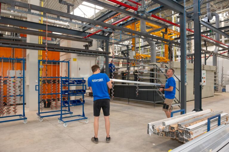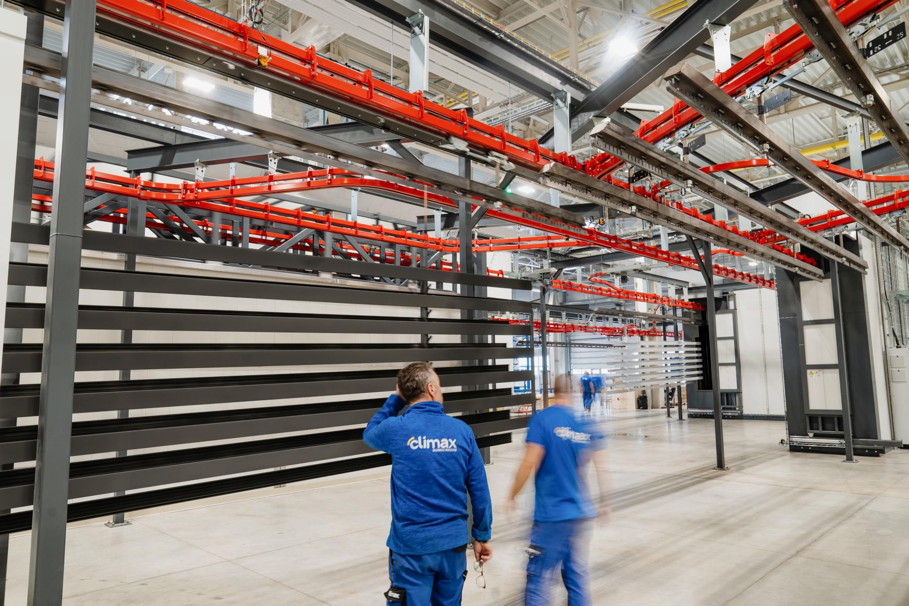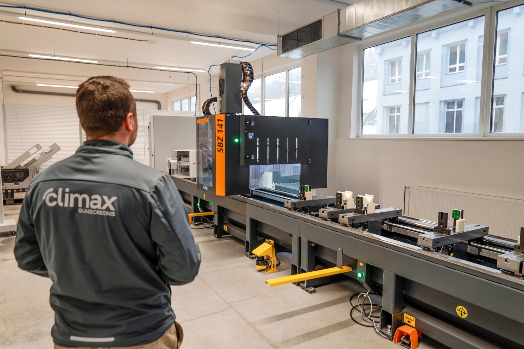 Pergola Lamelino je novinkou v nabídce stínicí techniky CLIMAXu. V hale 5 vyrábíme vlastní pergoly, které mohou být samostatně stojící nebo kotvené ke zdi. Výrobní proces zahrnuje řezání hliníkových profilů, obrábění na CNC stroji a ruční montáž jednotlivých součástí včetně elektroinstalace. Výroba byla otevřena v roce 2023.